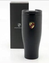 Hochwertiger Thermobecher in Geschenkverpackung in schwarzer Lackierung. Porsche-Wappen als eigenständiges Element auf Korpus platziert und Porsche-Schriftzug auf dem Deckel geprägt. Hält sowohl heiße Getränke warm, als auch kalte Getränke kühl. Deckel 100 % dicht.